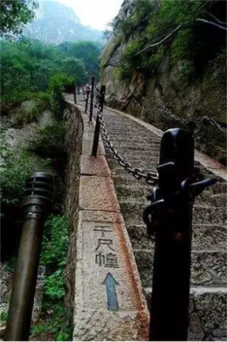 千尺幢是登華山的一段著名的險道,開鑿在懸崖峭壁上,直立千仞,氣象森然,被許多人視為畏途。像千尺幢這樣的登山道路,只有華山才有,華山也因為有了這樣的路才有了“奇”“險”的景色,奇與險成為華山特別突出的景觀特色。其它山岳也有險境,但都被掩埋在了雄或者秀等特色中,不像華山的險這般令人驚心動魄,這般讓人心潮澎湃。