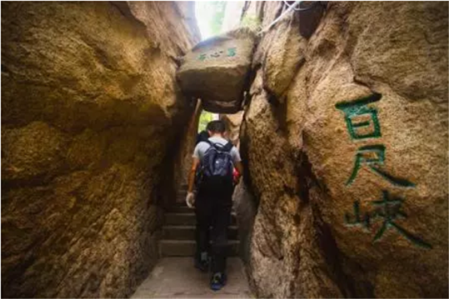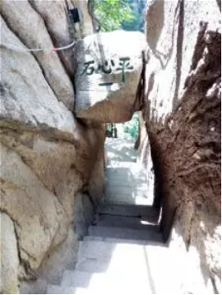 過千尺幢就是百尺峽。說千尺幢艱險,是每個爬華山的人都能體驗得到的,而百尺峽就不是那樣的險要了。但當(dāng)你上了百尺峽以后,眼前的一幕會讓人產(chǎn)生驚訝和不安。原來,在兩壁夾縫處有一塊懸石,似落非落的樣子,上面寫著“驚心石”三個字。人須從石下穿過,讓人不由得擔(dān)心它的穩(wěn)定性來,許多人產(chǎn)生畏葸不前的情緒來。待鼓足勇氣從石頭下走過去,回頭一看,又有“平心石”三個字在石頭上,才知是庸人自擾,虛驚一場。