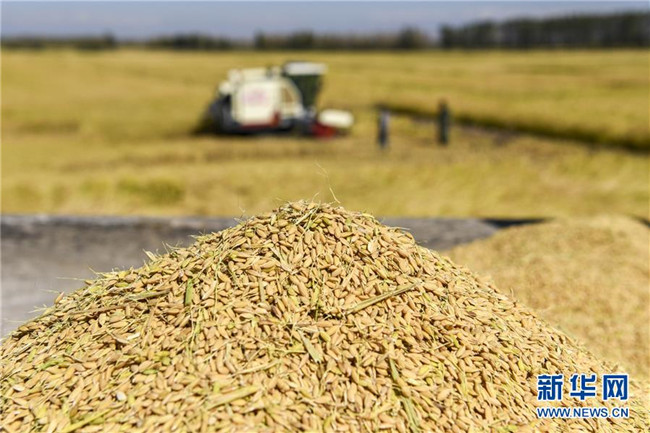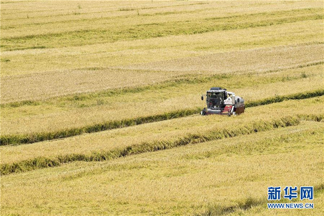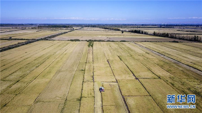 收割機在地處新疆察布查爾錫伯自治縣種羊場的“萬畝水稻優(yōu)質高產(chǎn)高效示范區(qū)”收割水稻(9月26日無人機拍攝)。眼下,地處新疆伊犁河谷的察布查爾錫伯自治縣約20萬畝水稻迎來收割季。當?shù)剞r(nóng)民搶抓農(nóng)時,忙碌在金色田園中。記者 胡虎虎 攝