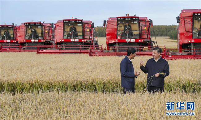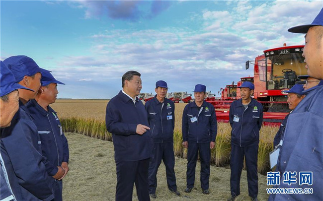 9月25日至28日,中共中央總書記、國家主席、中央軍委主席習(xí)近平在東北三省考察,主持召開深入推進(jìn)東北振興座談會。這是25日下午,習(xí)近平在黑龍江農(nóng)墾建三江管理局七星農(nóng)場萬畝大地號了解糧食生產(chǎn)和收獲情況。 新華社記者 謝環(huán)馳 攝
