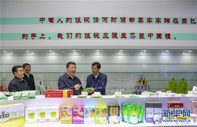 在一樓展示大廳,當(dāng)?shù)爻霎a(chǎn)的米油豆奶等各類農(nóng)產(chǎn)品琳瑯滿目,習(xí)近平逐一察看,強(qiáng)調(diào)中國人的飯碗任何時候都要牢牢端在自己的手上。他雙手捧起一碗大米,意味深長地說道:“中國糧食!中國飯碗!”