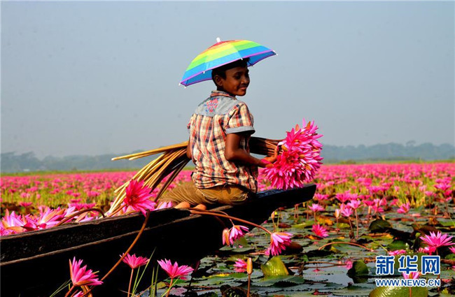 10月7日,在孟加拉國巴里薩爾地區(qū),當?shù)鼐用裨诓烧彙?近日,孟加拉國巴里薩爾地區(qū)的睡蓮進入盛開時節(jié)。 新華社發(fā)(薩利姆·禮薩 攝)