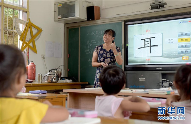 在安徽省黃山市黃山區(qū)烏石鎮(zhèn)清溪中心小學茶兒垅村教學點內(nèi),蔣秀蘭老師在給孩子們上語文課(9月7日攝)。今年53歲蔣秀蘭老師從1983年參加工作開始,一直獨自堅守在“一人一校”的單班教學點,最多的時候獨自一人帶過26名學生,目前她負責兩個年級5個孩子7門課的教學。 新華社記者 王正忠 攝
