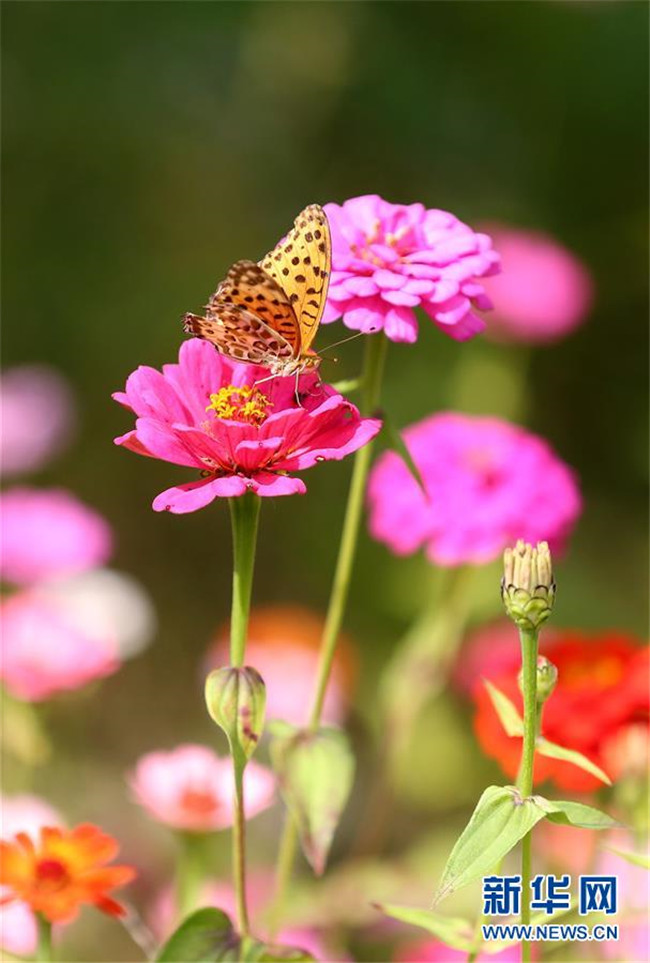 10月9日,在福建省泉州市德化縣桂陽(yáng)鄉(xiāng)一家生態(tài)園,百日菊競(jìng)相開放,引得蝴蝶蹁躚而至。  新華社發(fā)(張九強(qiáng) 攝)