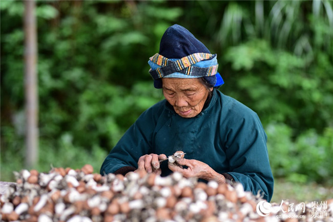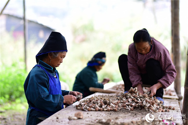 10月10日,村民在貴州省黔東南苗族侗族自治州丹寨縣排調(diào)鎮(zhèn)也改村姬松茸種植基地對(duì)剛采摘的姬松茸進(jìn)行削根處理。楊武魁 攝