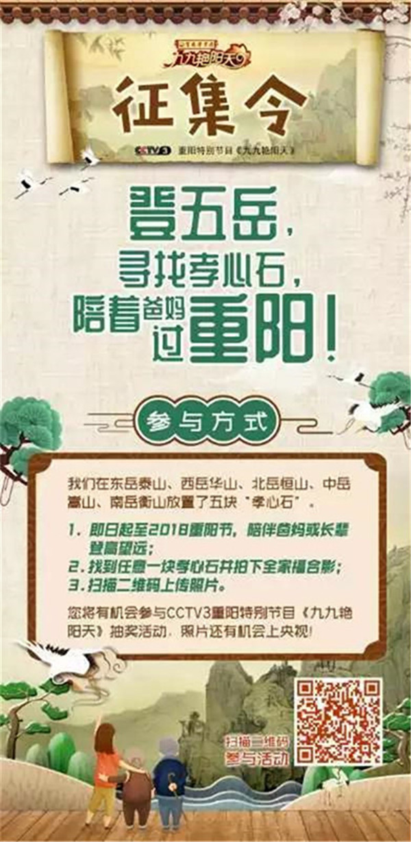 今天是2018年10月17日,農(nóng)歷九月初九重陽節(jié)。由中央廣播電視總臺央視綜藝頻道(CCTV-3)攜手中華五岳名山,共同舉辦的“登五岳 尋找孝心石 陪著爸媽過重陽”暨“福滿華夏 孝行五岳”最美笑容和祝福征集活動正在火熱進行當(dāng)中,活動至10月17日重陽節(jié)。只要您陪著爸爸媽媽在五岳任意一塊“孝心石”旁拍下全家福合影,并通過掃碼填寫報名表格,上傳圖片,就可以參加CCTV-3重陽特別節(jié)目《九九艷陽天》的抽獎活動,照片還有機會上央視哦!