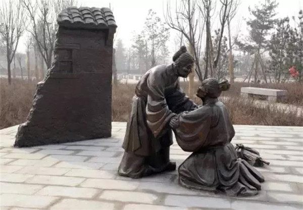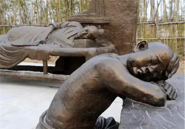 丁蘭,相傳為東漢時期河內(nèi)人,幼年時父母雙亡,他經(jīng)常思念父母的養(yǎng)育之恩,于是用木頭刻成雙親的雕像,事之如生,凡事均和木像商議,每日三餐敬過雙親后自己方才食用,出門前一定稟告,回家后一定面見,從不懈怠。久之,其妻對木像便不太恭敬了,竟好奇地用針刺木像的手指,而木像的手指居然有血流出。丁蘭回家見木像眼中垂淚,問知實情,遂將妻子休棄。