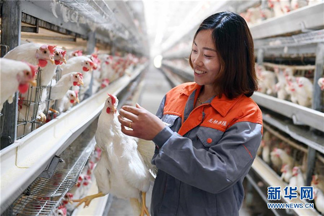 云南省鎮(zhèn)雄縣五德鎮(zhèn)渡船壩社區(qū)農(nóng)家女劉艷外出務工多年后返鄉(xiāng)創(chuàng)業(yè),帶動鄉(xiāng)親們發(fā)展山地生態(tài)雞和優(yōu)質(zhì)蛋雞養(yǎng)殖增收脫貧。這是劉艷在養(yǎng)殖場查看優(yōu)質(zhì)蛋雞(6月4日攝)。新華社記者 楊宗友 攝