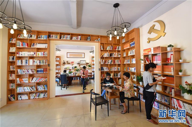 海南省萬寧市山根鎮(zhèn)大石嶺村村民在村黨支部帶領(lǐng)村民共建的農(nóng)家書屋內(nèi)讀書(5月16日攝)。 新華社記者 李鑫 攝