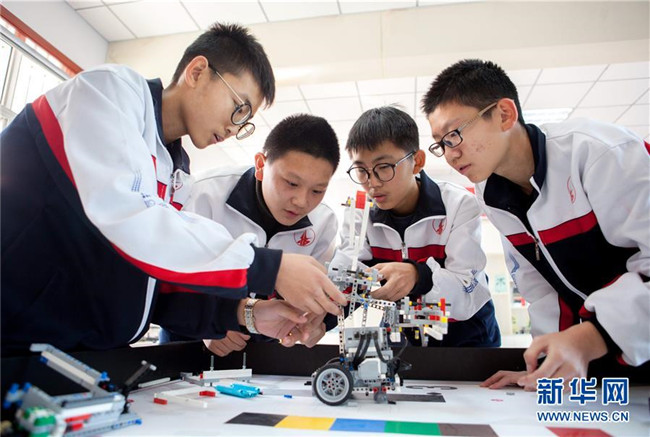 10月31日,在河北武邑中學,學生練習組裝機器人。