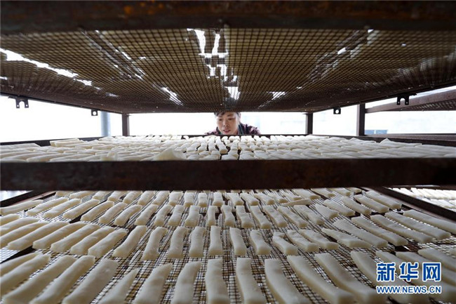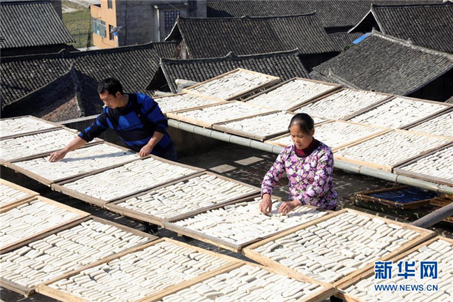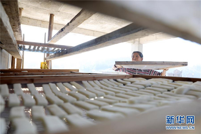 11月4日,在貴州省黎平縣中潮鎮(zhèn)佳所侗寨,村民在晾曬“侗果”粑塊。 近日,貴州省黔東南苗族侗族自治州黎平縣中潮鎮(zhèn)佳所侗寨的村民們搶抓晴好天氣,忙著制作、晾曬“侗果”,侗寨里一派忙碌。“侗果”是當(dāng)?shù)囟弊逋捅貍涞奶厣朗?,是將蒸熟的糯米切成小粑塊后,再經(jīng)曬干、油炸、澆紅糖和上芝麻等工序制作而成。 新華社發(fā)(楊代富 攝)