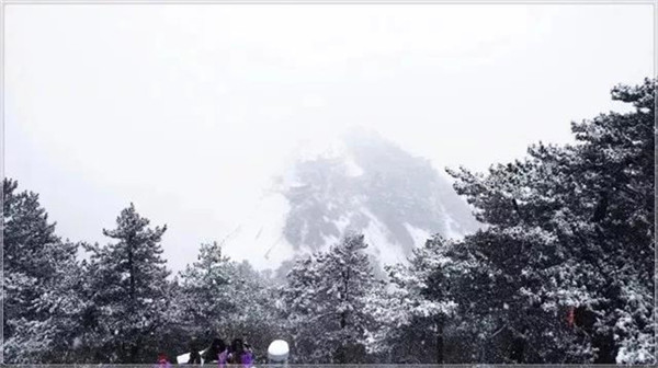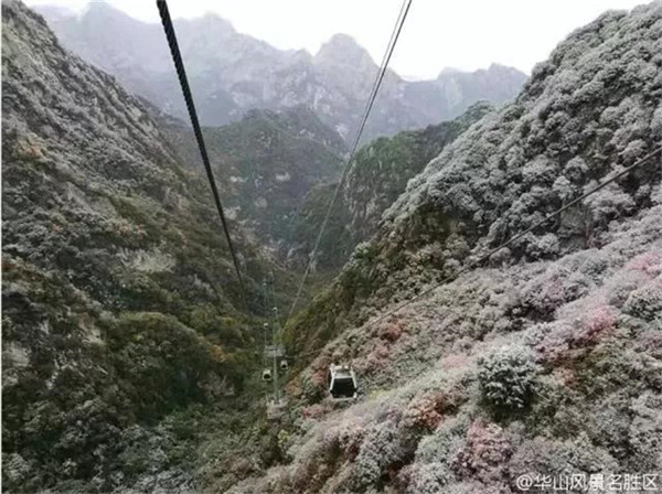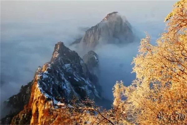 當(dāng)滿山的紅葉還依舊掛在樹枝,露出嬌羞的笑臉時,秋末的華山,已經(jīng)下起了今年的第一場雪。放眼望去,整座山體好像被薄薄的彩衣包裹,若隱若現(xiàn)。