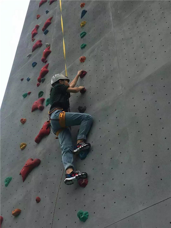 換上攀巖鞋、穿好安全帶,帶好安全帽,抓緊手窩踩實(shí)腳窩,手腳并用的攀上巖壁……如果不慎踏空,那就有可能飛身而下,攀巖者可從頭再來(lái)。