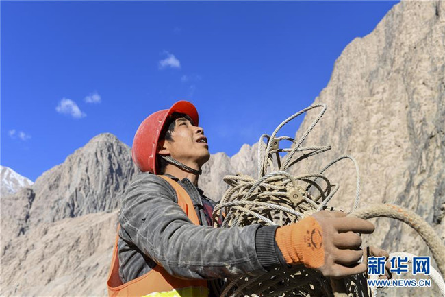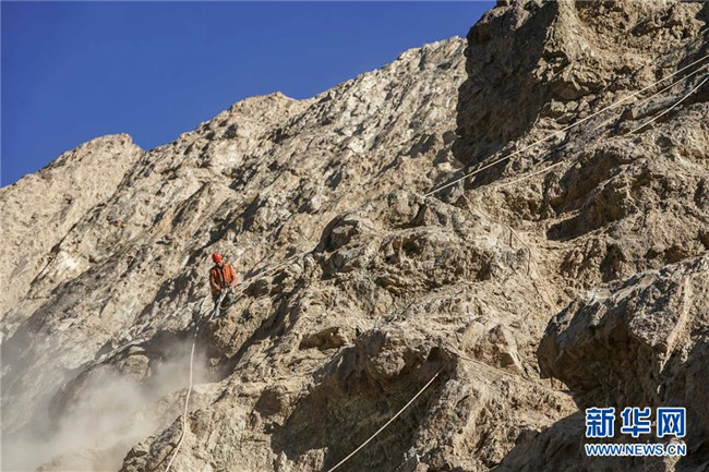 11月12日,在新疆塔什庫爾干塔吉克自治縣大同鄉(xiāng)鄉(xiāng)政府附近的一處路段,工人背著施工設(shè)備在峭壁上攀爬。 近日,一支由四川、云南等地工人組成的施工隊(duì)忙碌在帕米爾高原深處的大山中,為塔什庫爾干塔吉克自治縣縣城至大同鄉(xiāng)道路的易落石路段安裝防護(hù)網(wǎng)。崇山峻嶺間,工人要攀爬至峭壁上施工作業(yè),如躍動(dòng)在大山間的“舞者”。據(jù)介紹,這支施工隊(duì)常年活躍在新疆山區(qū)道路的施工現(xiàn)場,為風(fēng)險(xiǎn)路段加裝安全防護(hù)裝置,保障過往車輛和沿途村民出行安全。 新華社記者 胡虎虎 攝