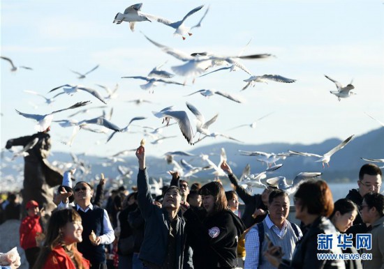 近日,云南省昆明市陽光明媚、氣候宜人,不少市民和游客來到滇池大壩、大觀公園等地,觀賞前來越冬的紅嘴鷗。新華社記者 藺以光 攝