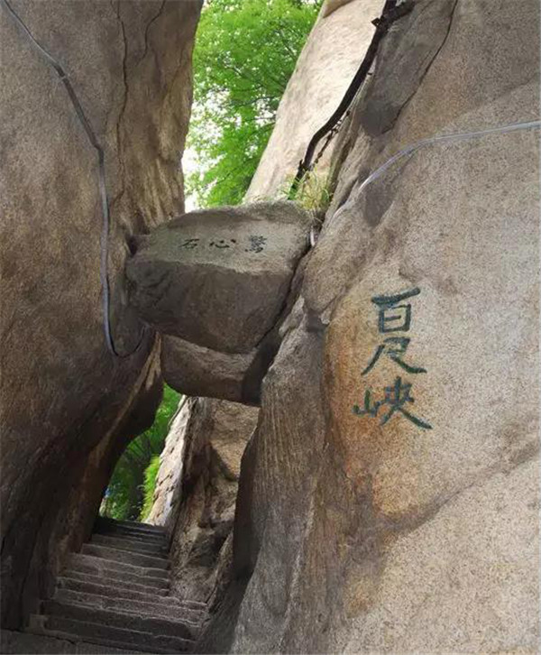 也叫“百丈崖”,過了千尺幢向北折即可到達,是登華山的第二個險境。這里山體峭陡壁立、四方如削,猶如斧子直辟而開,幾近垂直90度,在旁邊山體覆滿的墨綠植被的映襯下,華山的陽剛挺拔之態(tài)盡顯。和千尺幢一樣,百尺峽也是巖隙險道,有石階91級,游人須挽鐵索而上。