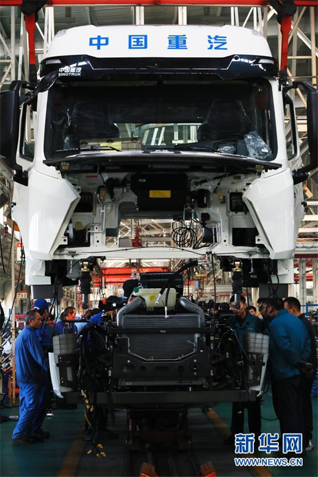 工人在中國(guó)重汽集團(tuán)濟(jì)寧商用車總裝生產(chǎn)線上裝配汽車(11月22日攝)。 新華社發(fā)(李明放 攝)
