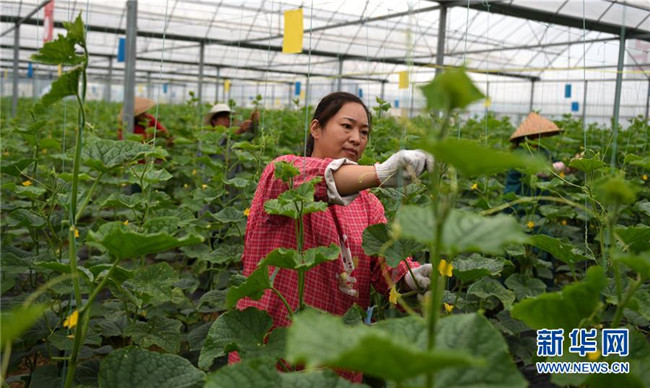 在河南新蔡縣磚店鎮(zhèn),一位村民在產(chǎn)業(yè)扶貧基地黃瓜溫棚里勞動(dòng)(9月10日攝)。新華社發(fā)(宋超喜攝)
