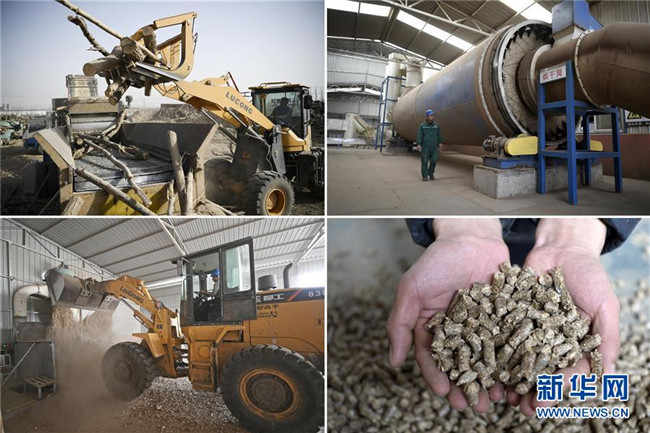 這是由11月27日拍攝的照片組成的拼版照片:左上圖為粉碎設(shè)備將秸稈、廢棄木材初步粉碎;右上圖為秸稈、廢棄木材經(jīng)過粉碎后進(jìn)行烘干處理;左下圖為工作人員用鏟車將初步粉碎的渣料填入機器進(jìn)行處理;右下圖為秸稈、廢棄木材制成的生物質(zhì)顆粒燃料。