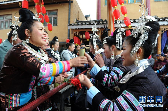 12月9日,貴州省黎平縣中潮鎮(zhèn)佳所侗寨的村民在攔門敬酒。 新華社發(fā)(楊文斌 攝)