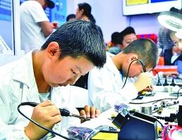 2018世界機(jī)器人大會上,小學(xué)生在焊接用于編程的模塊。新華社發(fā)