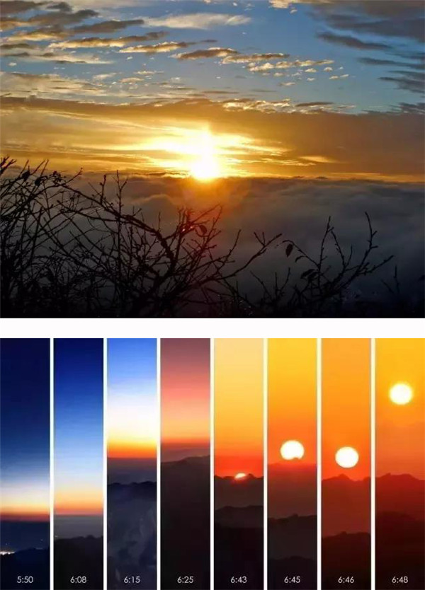 “狂飆”烈,墨云散!千嶺萬壑悄然隱退,東方泛白天地寬!靜靜場(chǎng)面又代替了震岳狂歡。??!太陽出來了:像純潔高尚的童心,顯出誠實(shí)友愛的靦腆;像碧葉襯托鮮花,讓有情人思緒紛繁;像大海里一盞明燈,召喚勇敢者揚(yáng)帆;像新娘子揭開“紅蓋頭”,又化作彩霞紅了天,迎接斑斕多姿的“友情客串”。
