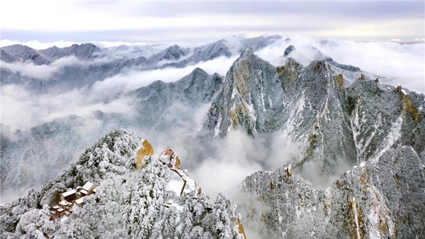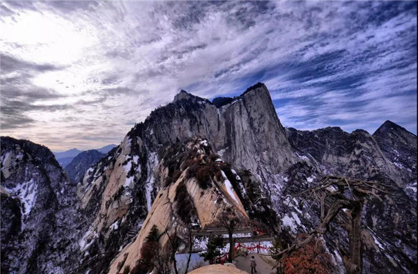 華山由五峰組成,其中東西南三峰呈鼎興相依,是為主峰,中峰和北峰相輔,而且還有七十多座小峰環(huán)衛(wèi)而立,宛如層層花瓣。五峰鼎峙聳立,高插云霄,形如刀削,登臨絕頂,頓覺“只有天在上,更無山與齊”之感。
