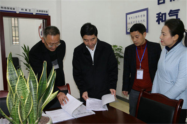 在張壩司法所,劉志誠(chéng)察看了社區(qū)矯正宣告室、人民調(diào)解室、法律援助工作站,仔細(xì)翻閱相關(guān)資料,關(guān)切詢(xún)問(wèn)工作人員司法所人民調(diào)解、法律援助等業(yè)務(wù)工作情況及對(duì)司法行政工作意見(jiàn)建議。走進(jìn)龍馬潭區(qū)誠(chéng)達(dá)公證處,映入眼簾的標(biāo)識(shí)標(biāo)牌讓劉志誠(chéng)對(duì)該處的黨建引領(lǐng)和文化建設(shè)表示滿(mǎn)意,他親切地與公證員交流互動(dòng),了解公證處黨建促發(fā)展、公證參與司法輔助、“最多跑一次”、等工作情況。劉志誠(chéng)指出,公證服務(wù)是黨委政府為民服務(wù)的形象和代表,要把人民群眾滿(mǎn)不滿(mǎn)意作為檢驗(yàn)公證工作成效的標(biāo)準(zhǔn),全心全意為群眾做好法律服務(wù)。在自貿(mào)區(qū)在建瀘州市公共法律服務(wù)中心,劉志誠(chéng)指出,公共法律服務(wù)中心是服務(wù)群眾的窗口,在設(shè)計(jì)規(guī)劃中要拓寬思路,整合法律服務(wù)功能,從便民利民出發(fā),從群眾的需要做起,將公共法律服務(wù)中心建成群眾滿(mǎn)意、企業(yè)滿(mǎn)意、黨委政府滿(mǎn)意的標(biāo)準(zhǔn)化服務(wù)平臺(tái)。