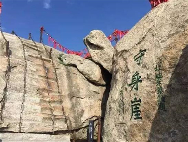 位于華山西峰頂摘星石北。民間傳說古時(shí)有個(gè)孝子,雙親身染重疾,久治不愈,聽說岳神靈驗(yàn),便登山拜神求醫(yī)。在向岳神祈禱的過程中,孝子許愿說只要雙親病愈,愿舍去自己的性命來報(bào)答神靈。果然,當(dāng)孝子返回家中時(shí),父母都已康復(fù),且已下田耕作去了。孝子還愿來到華山,毫不猶豫的從此處跳下深淵,可他卻覺得身體若有人托起,似乘長風(fēng),飄飄欲仙。待清醒時(shí),原來依然躺在家中,似夢非夢。孝子知道是華山神暗中相助,便告別父母到華山西峰作了道士。后人被孝子的誠心感動,就將此處命名為舍身崖。 清道光年間李榕的伯祖李仁龍為阻止后人仿效孝子的行為,改舍身崖為省身崖,以警示忤逆之街徒游到這里時(shí)應(yīng)對照孝子,自警自省,痛改前非。后來又有人認(rèn)為舍身救雙親的行為并不可取,也稱崖作守身崖,以教育后人生命可貴,不可輕擲。