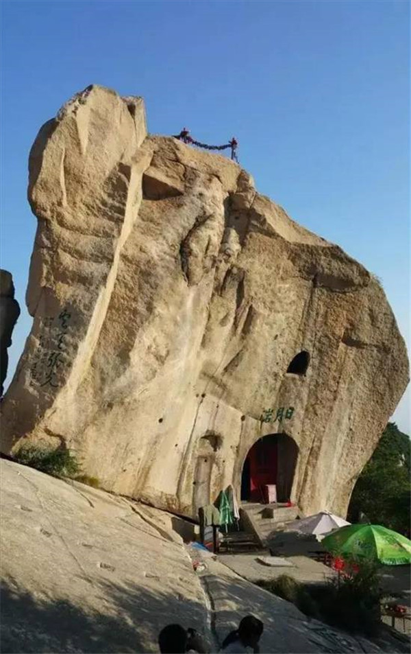 看過金庸武俠小說的童鞋們,一定聽過全真教。那么全真崖呢?它位于南天門西,為松檜峰頂向南懸空傾伸之崖石。出南天門越長空棧道可至崖下。崖腹部有賀老石室,是元初道士賀志真開辟的修行之地?!赌戏逵洝分杏浭觯?ldquo;巖類俯首形,遙覆室上,上書“全真巖”三字,赤色以實(shí)之。雖知人所為,然上不可下,下不可上,其履虛而作之邪?何其神也!”