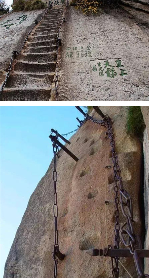 華山,被譽(yù)為奇險(xiǎn)天下第一山。它有著布滿奇險(xiǎn)的自古華山一條路,其中包括千尺幢、百尺峽、老君犁溝;它有著垂直90°的云梯;它有著一邊懸崖、一邊峭壁的長(zhǎng)空棧道;它有著寒索垂于凌空的鷂子翻身。來華山挑戰(zhàn)自我、挑戰(zhàn)奇險(xiǎn),感受大自然的神奇。