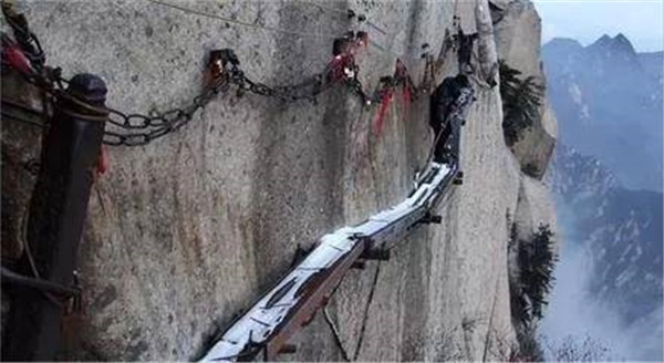 長(zhǎng)空棧道,可謂華山險(xiǎn)道之首,它猶如一道奇異的仙練鑲嵌在南峰絕壁。明代“后七子”之一的李攀龍《太華山記》載:“出南天門(mén)向西就是棧道,棧雖有銅柱鐵索攔護(hù),然闊不盈尺。行二十余丈方至盡頭。下折為井,高約三丈,旁出復(fù)為棧……”置身其中,只覺(jué)背空腳虛,發(fā)豎氣閉,寒風(fēng)沖襠,骨松筋緊,膽大者有凌空欲飛之感,膽弱者心生抵近鬼門(mén)之憂(yōu)。多少年來(lái)“長(zhǎng)空棧道”以它特有的絕險(xiǎn)情懷召喚著天下英雄豪杰一試身手,體驗(yàn)驚心動(dòng)魄,揮灑豪邁人生。