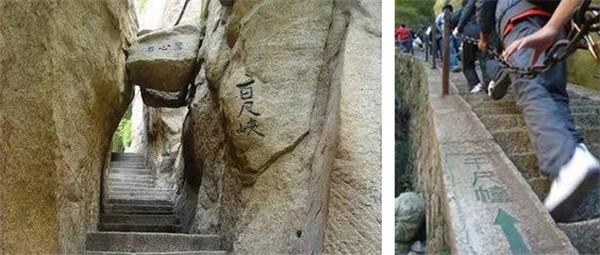 千尺幢,是經(jīng)華山峪登主峰的必經(jīng)之道。這里原為一崖間裂隙,直立70度,后來(lái)人們沿隙鑿?fù)爻陕?,有石階370級(jí),階寬僅容半足,游人登臨時(shí),仰視一線天,俯視若臨深井。百尺峽在“千尺幢上,也是巖隙險(xiǎn)道,有石階91級(jí),游人須挽索而上。有詩(shī)云:“幢去峽復(fù)來(lái),天險(xiǎn)不可瞬,雖云百尺峽,一尺一千仞”。
