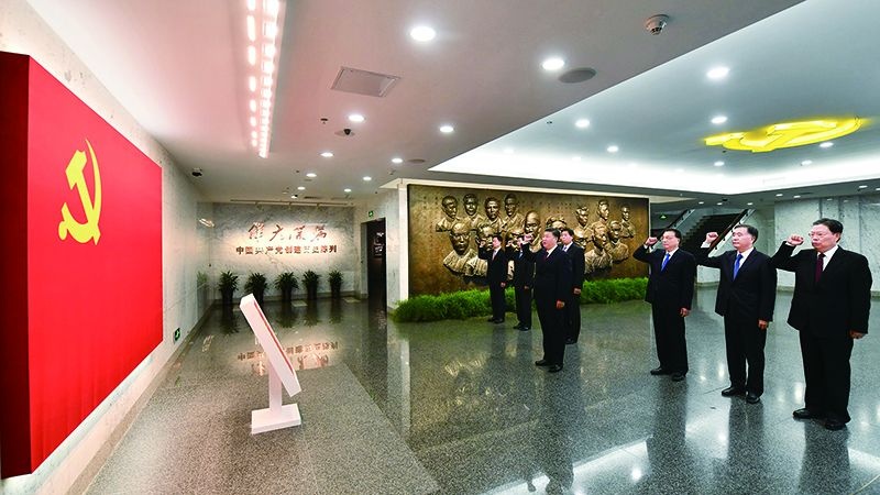 2017年10月31日,中共中央總書記、國家主席、中央軍委主席習(xí)近平帶領(lǐng)中共中央政治局常委李克強、栗戰(zhàn)書、汪洋、王滬寧、趙樂際、韓正,瞻仰上海中共一大會址和浙江嘉興南湖紅船。這是31日上午,在上海中共一大會址紀念館,習(xí)近平帶領(lǐng)其他中共中央政治局常委同志一起重溫入黨誓詞。 新華社記者 李濤/攝