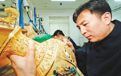 圖為獲得“北京大工匠”稱(chēng)號(hào)的工藝美術(shù)大師陳令勇在進(jìn)行花絲鑲嵌。本報(bào)記者賀勇攝