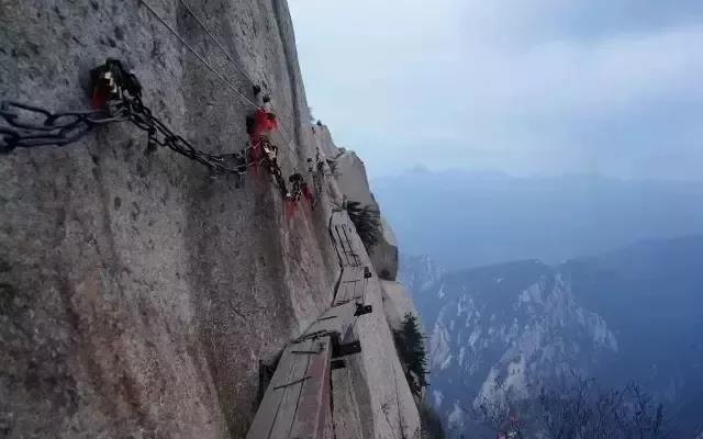 長空棧道:長空棧道位于華山南峰東側(cè)山腰,是華山派第一代宗師元代高道賀志真為遠(yuǎn)離塵世靜修成仙,在萬仞絕壁上鑲嵌石釘搭木椽而筑。棧道上下皆是懸崖絕壁,鐵索橫懸,由條石搭成尺許路面,下由石柱固定,游人至此,面壁貼腹,屏氣挪步,被喻為“華山第一天險(xiǎn)”。