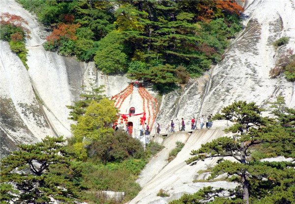 相傳秦穆公的女兒弄玉與居住在華山明星崖的吹簫人蕭史相愛后,練習(xí)辟谷之法,乘龍跨鳳,騰空來至華山,鑿洞成婚并得道成仙,“洞房”一詞也是源于此。情侶們來到這里拍照留念,也是對婚姻的一種向往。