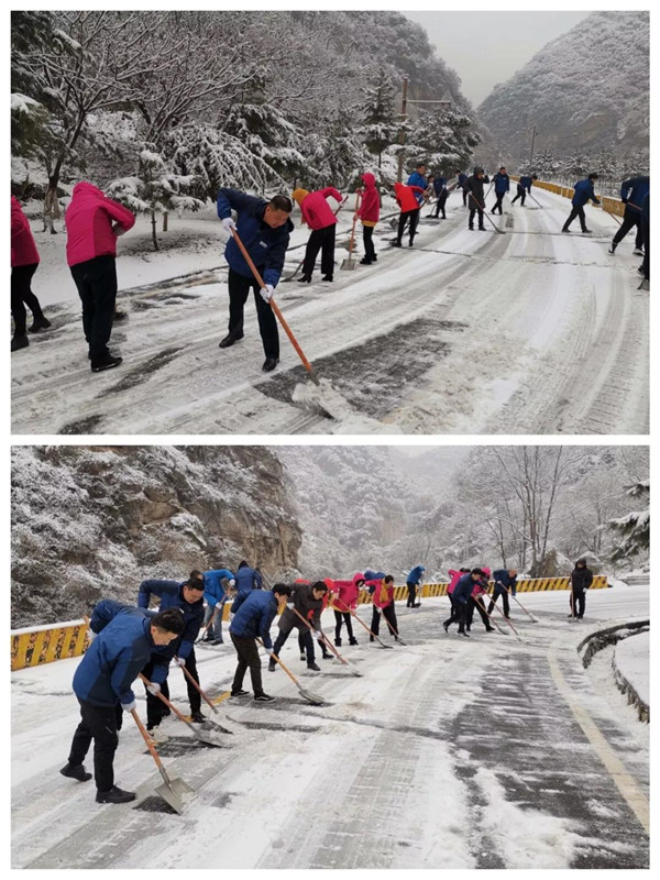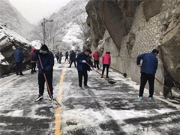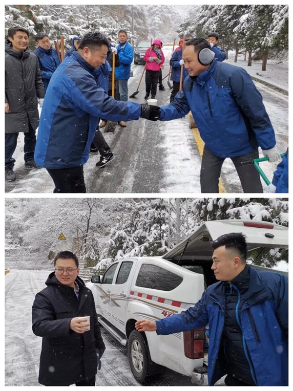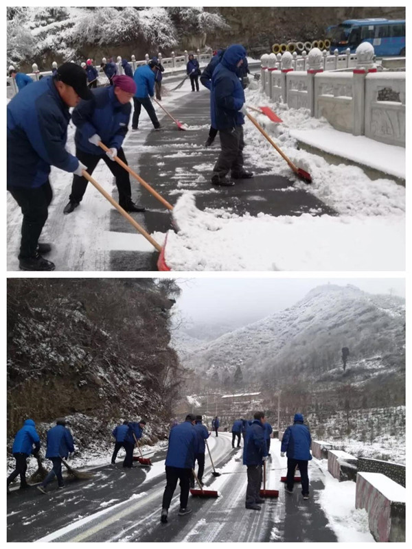 1月31日凌晨景區(qū)出現(xiàn)強降雪天氣,道路積雪嚴重影響行車安全。華旅集團第一時間多渠道發(fā)布景區(qū)推遲運營時間的信息,并向游客做好解釋工作,同時號召集團各部室、各單位迅速組織人員赴進山公路進行掃雪除冰,經(jīng)過三個小時的全力清掃,東線進山公路積雪清理完畢,景區(qū)在短時間內(nèi)恢復(fù)運營,西線索道進山公路及華山峪區(qū)域不斷加大清掃力度,盡力實現(xiàn)景區(qū)全線貫通。