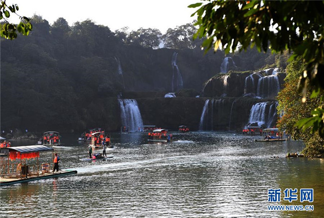 位于中越國(guó)際旅游合作區(qū)的大新縣德天瀑布,游客如織(2月8日攝)。新華社記者 周華 攝