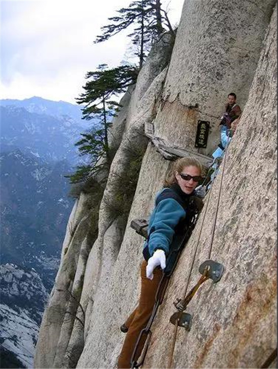 華山道路最危險(xiǎn)的地方當(dāng)屬“長(zhǎng)空棧道”,13英尺長(zhǎng),1英尺寬的木板就修在垂直的懸崖之上。在那里的一個(gè)失足就會(huì)使你墜入下面的萬丈深淵。棧道上有安全帶加以保護(hù),如果你想冒險(xiǎn)嘗試,綁上安全帶并把你系在繩索上,在一些地段,僅有一條安全帶和一些鑿在石頭里的腳窩作為支撐。