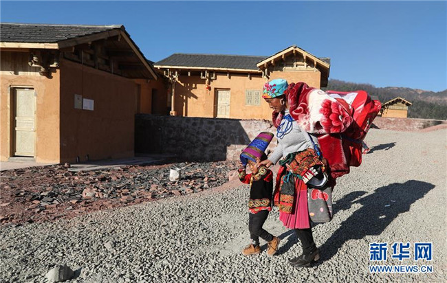 在昭覺縣三河村易地扶貧安置點(diǎn),馬海阿依帶著女兒搬進(jìn)新居(2月11日攝)。2月11日,三河村首批29戶、168人告別居住多年的土坯房,搬入易地扶貧安置點(diǎn)的新家。新華社記者 江宏景 攝