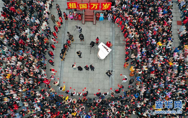 2月25日,湖南省衡陽市南華大學(xué)師生在開學(xué)主題活動(dòng)上齊唱《我和我的祖國》(無人機(jī)拍攝)。 新華社發(fā)(曹正平 攝)