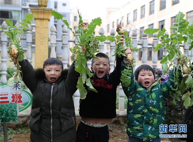 2月25日,在貴州省銅仁市玉屏侗族自治縣平溪街道第二幼兒園,孩子們在開學(xué)主題活動(dòng)上展示自己拔的蘿卜。新華社發(fā)(胡攀學(xué) 攝)