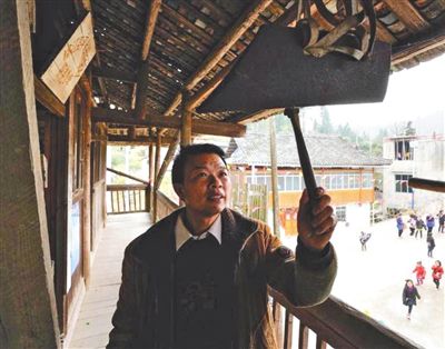 代課教師潘平忠在孖堯教學(xué)點教學(xué)樓二樓敲簡易制作的上課鈴。