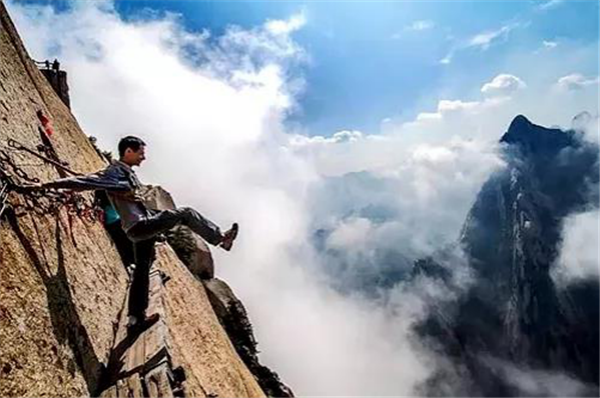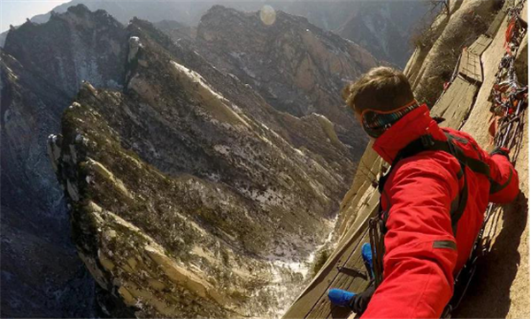 我獨(dú)自一人出發(fā),一段垂直的石隙,鐵條插在巖石之中,道路向下延伸,風(fēng)刮得很大,我雙手麻木,死死地抓住鐵鏈,慢慢向下挪動(dòng),腳下是一千米深的峽谷,這是一個(gè)恐懼與光榮交織的時(shí)刻。我走在棧道上,左右上下地欣賞著風(fēng)景,周圍大山巨大而孤獨(dú),我感覺自己就像是一個(gè)塵埃,真的太渺小了。冰屑落到頭頂上,幸虧不是石塊。我聽到一群中國游客笑著從石隙中下來,我停下來照了幾張相,要回去必須原路返回,這同樣不容易,我很感謝地歸還了手套,繼續(xù)向其他山峰攀登。由于有安全保護(hù)措施,因此我不認(rèn)為華山是“世界上最危險(xiǎn)的道路”。