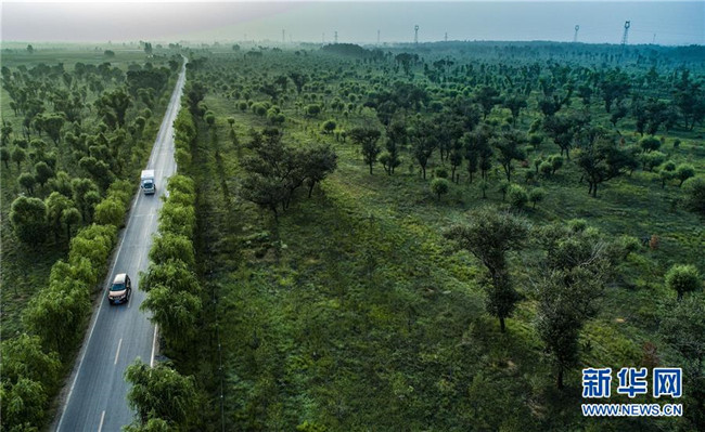 汽車行駛在陜西省榆林市靖邊縣東坑鎮(zhèn)新建村的道路上(2018年8月1日無人機拍攝)。陜西省開展的天然林保護工程和全面治理荒沙行動,極大改善了毛烏素的生態(tài)環(huán)境,也使沙漠南緣的陜西省榆林市實現(xiàn)從“沙進人退”到“綠進沙退”的轉(zhuǎn)變。 新華社記者 陶明 攝