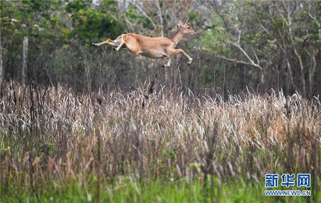 在海南大田坡鹿自然保護區(qū)內(nèi),一只坡鹿飛躍草叢(2018年4月3日攝)。國家一級保護動物海南坡鹿是特產(chǎn)于海南島的熱帶珍稀鹿種,20世紀曾瀕臨滅絕。近年來,當(dāng)?shù)赝ㄟ^多種方式開展保護。現(xiàn)在,海南坡鹿數(shù)量逐漸增多、種群逐漸穩(wěn)定,成為海南綠色生態(tài)的一張名片。 新華社記者 楊冠宇 攝