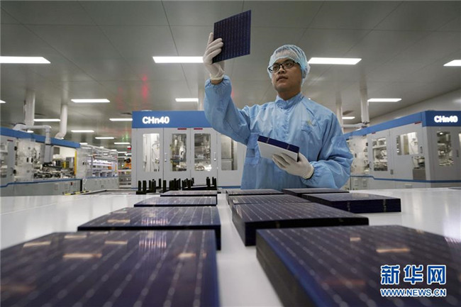 英利能源(江西)有限公司員工在檢測光伏電池片(2018年12月11日攝)。新華社記者 宋振平 攝