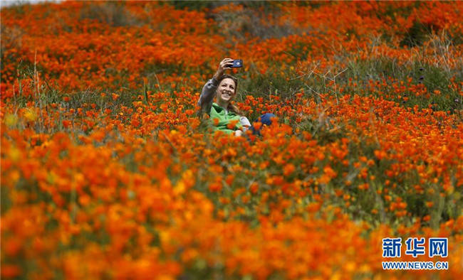 3月10日,在美國加利福尼亞州埃爾西諾湖地區(qū),一名游客在花叢中拍照。