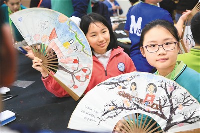 兩岸和平小天使在臺北民族小學的特色藝術(shù)課程上繪制扇面。